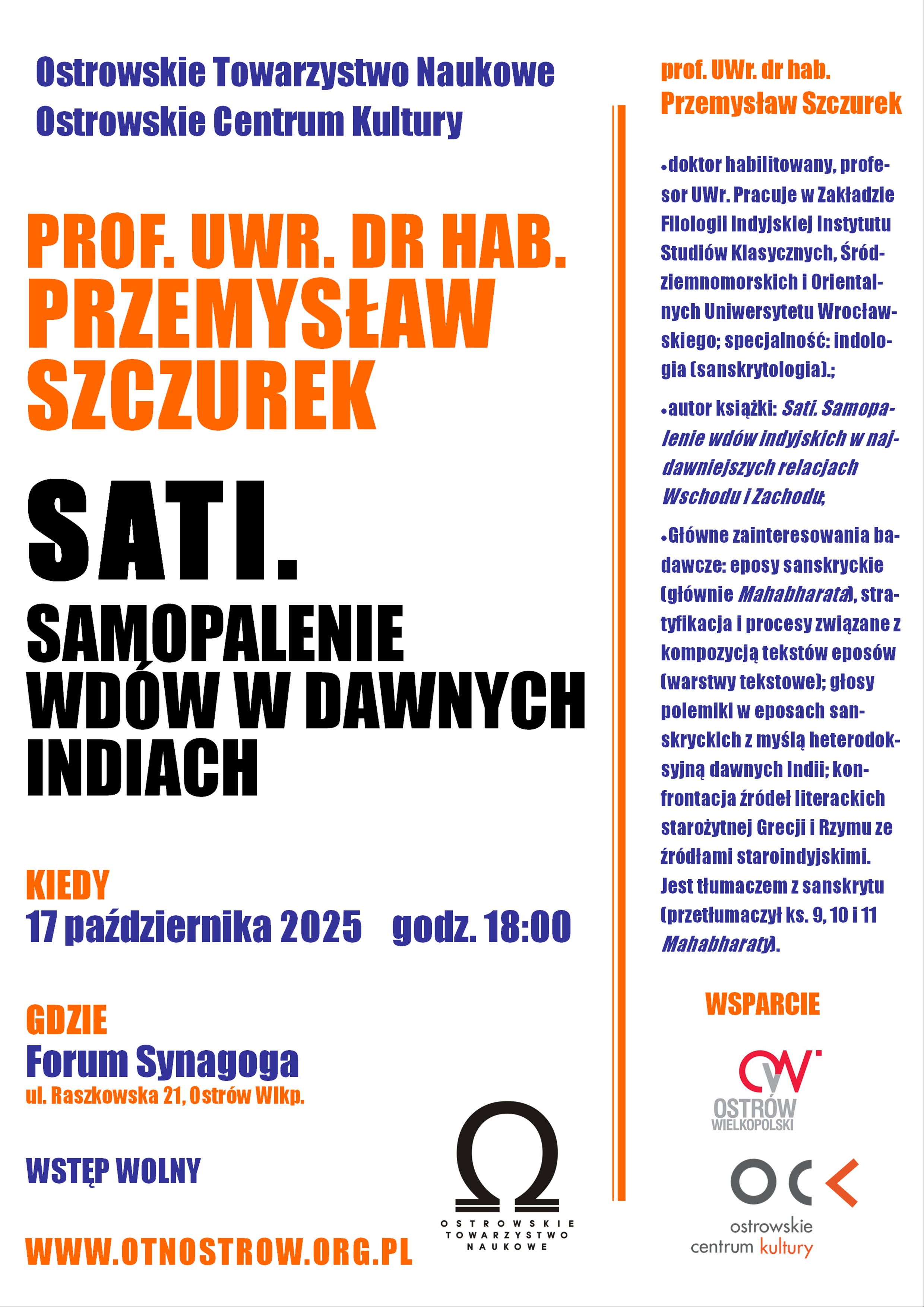 Zapraszamy na kolejny, 70. już wykład organizowany w ramach Forum Ostrowskiego Towarzystwa Naukowego. Wygłosi go indolog, prof. UWr dr hab. Przemysław Szczurek, autor książki pt. Sati. Samopalenie wdów w najdawniejszych relacjach Wschodu i Zachodu.